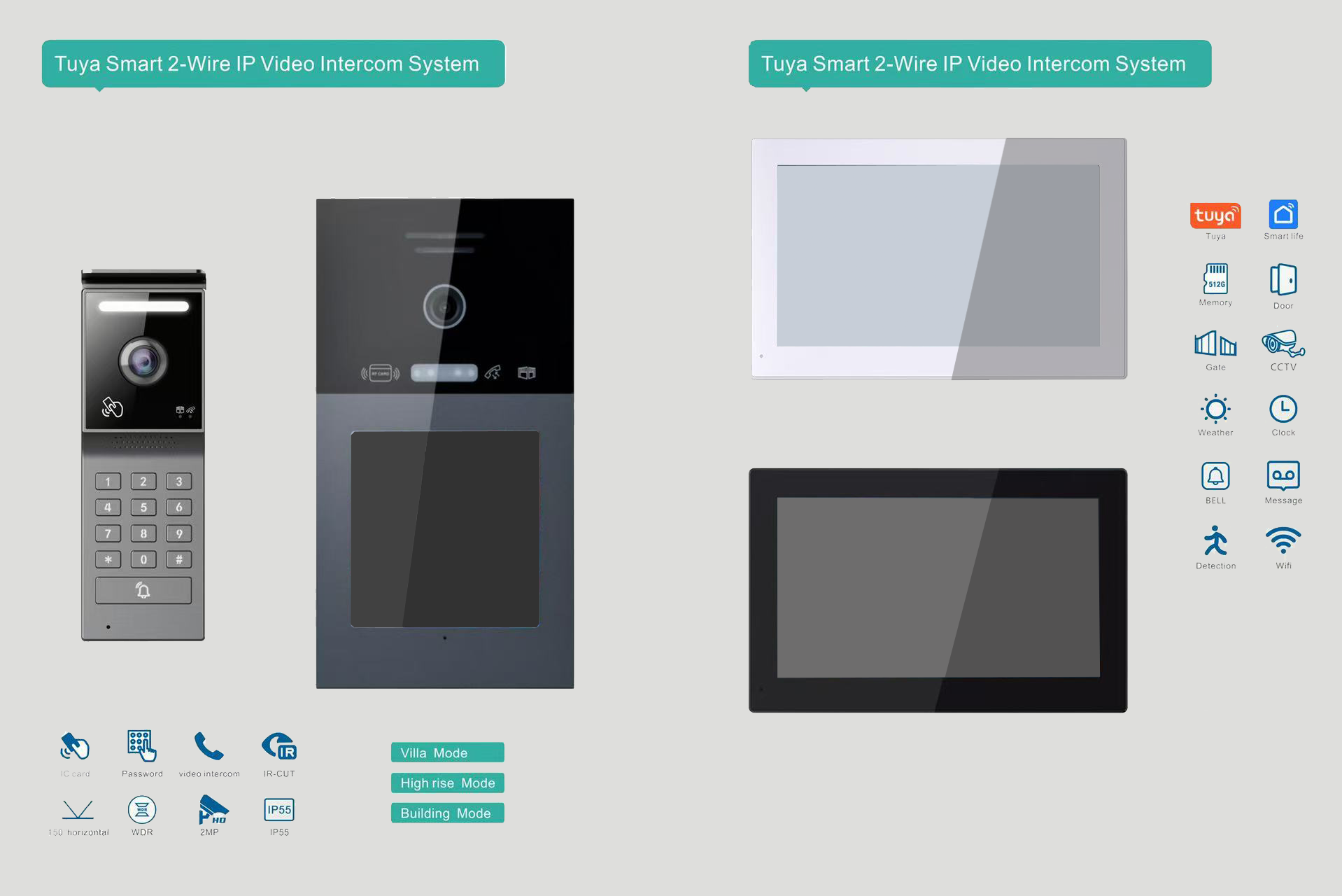 The Tuya Smart 2-Wire IP Video Intercom System is a versatile access control solution designed for villa high-rise and multi-building applications. Featuring 2MP HD video with IR-CUT night vision and 150° horizontal view, it ensures clear visitor identification day and night.It supports flexible unlocking methods including IC card password and smartphone app remote unlock, while the system can be controlled via the Tuya app for remote access management. Built with IP55-rated protection, the outdoor station adapts to various weather conditions.