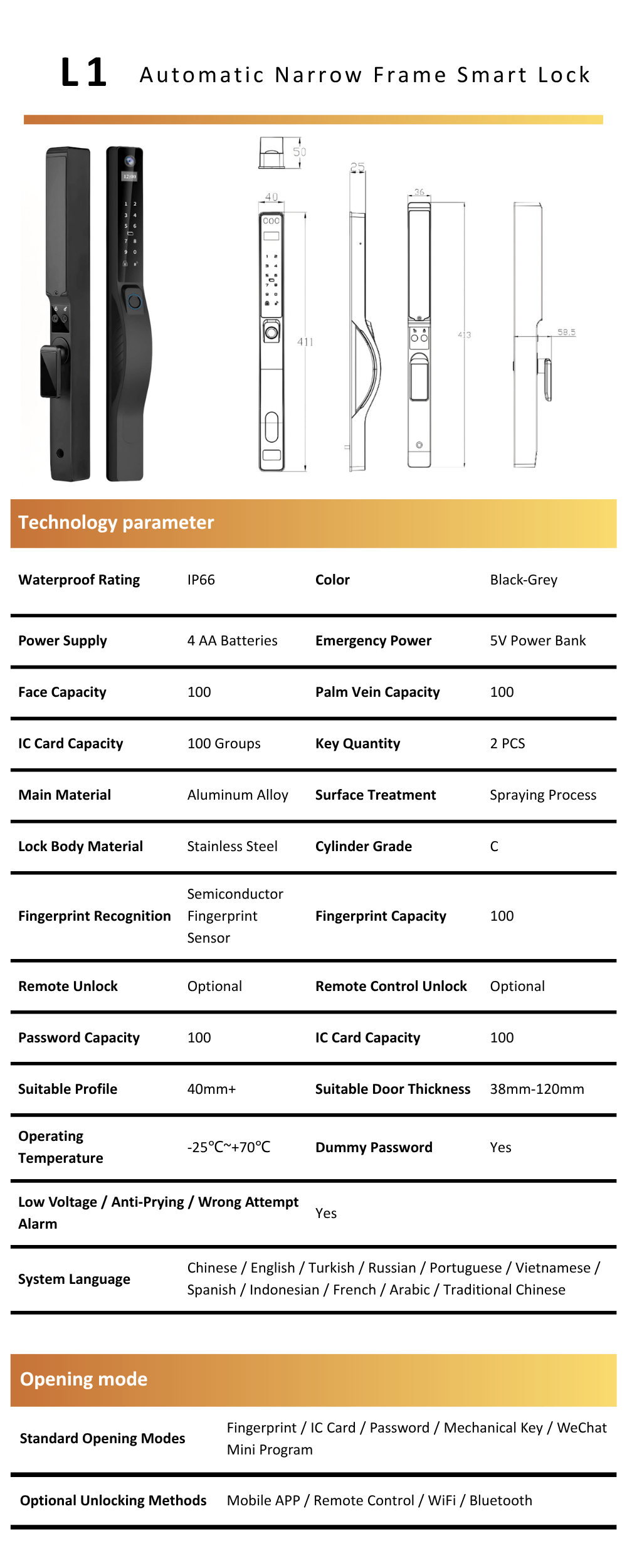 The L1 is a cutting-edge fully automatic narrow frame smart lock designed for modern smart home and commercial access control. It combines a durable aluminum alloy construction with an IP66 waterproof rating, ensuring long-term reliability in various environments. Equipped with advanced biometric technologies including face recognition, palm vein scanning and semiconductor fingerprint sensor, it offers fast, secure and convenient access.