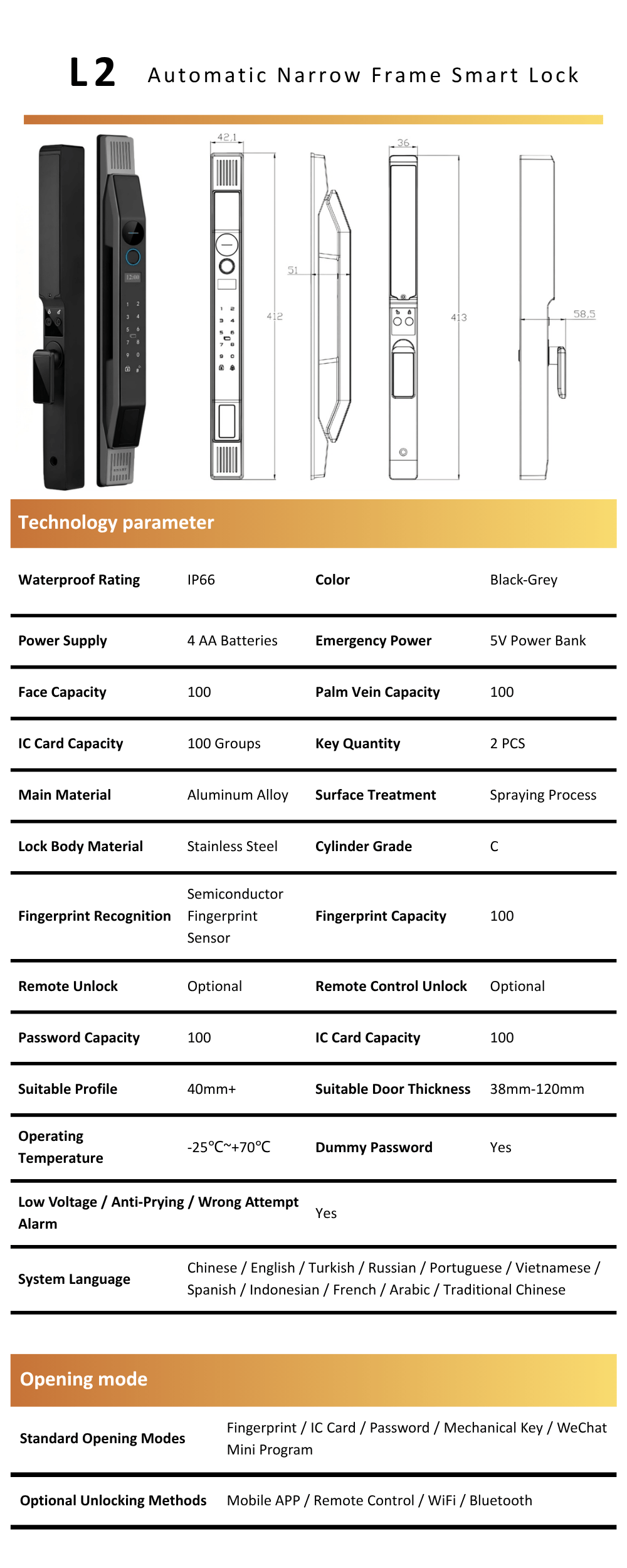 - Comprehensive Security: C-grade cylinder, anti-prying, wrong attempt and low voltage alarms