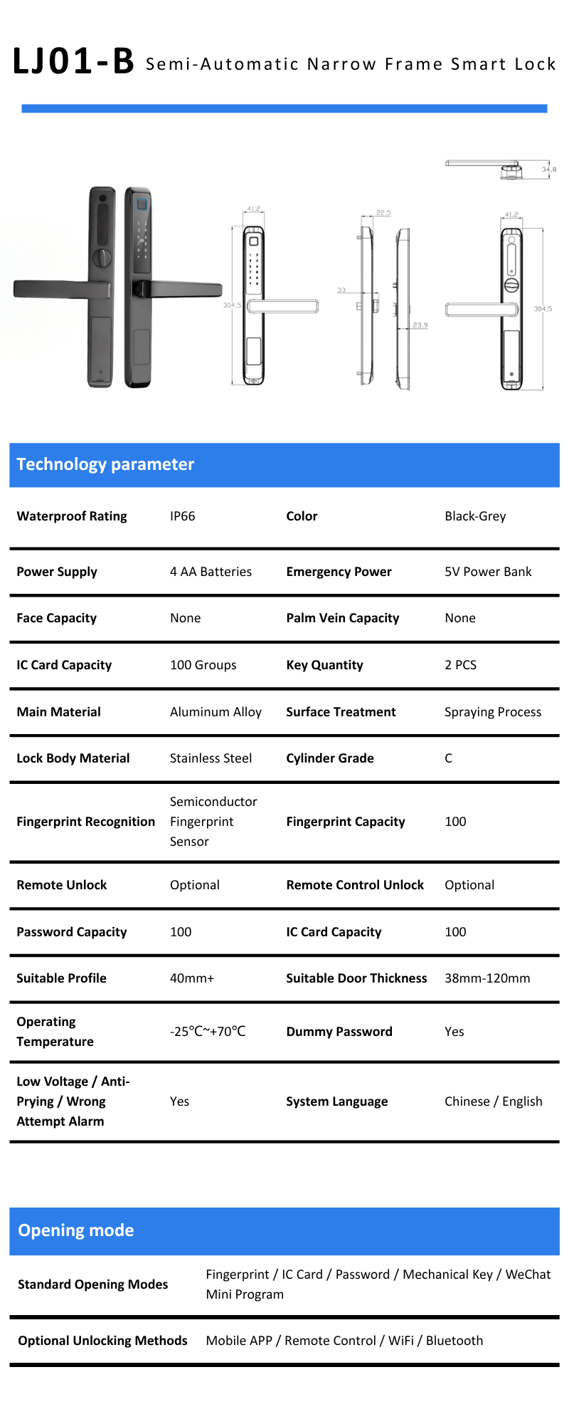The LJ01-B is a purpose-built semi-automatic smart lock for narrow frame doors. Engineered with a durable aluminum alloy body and stainless steel lock body, it delivers IP66 waterproof performance and reliable operation in extreme temperatures from -25°C to 70°C. It supports multiple convenient unlocking methods including fingerprint, IC card, password, mechanical key and WeChat Mini Program, with optional remote access via APP, WiFi or Bluetooth.