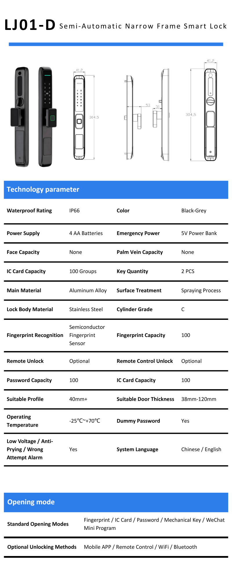 The LJ01-D is a purpose-built semi-automatic smart lock for narrow frame doors. Engineered with a durable aluminum alloy body and stainless steel lock body, it delivers IP66 waterproof performance and reliable operation in extreme temperatures from -25°C to 70°C. It supports multiple convenient unlocking methods including fingerprint, IC card, password, mechanical key and WeChat Mini Program, with optional remote access via APP, WiFi or Bluetooth.