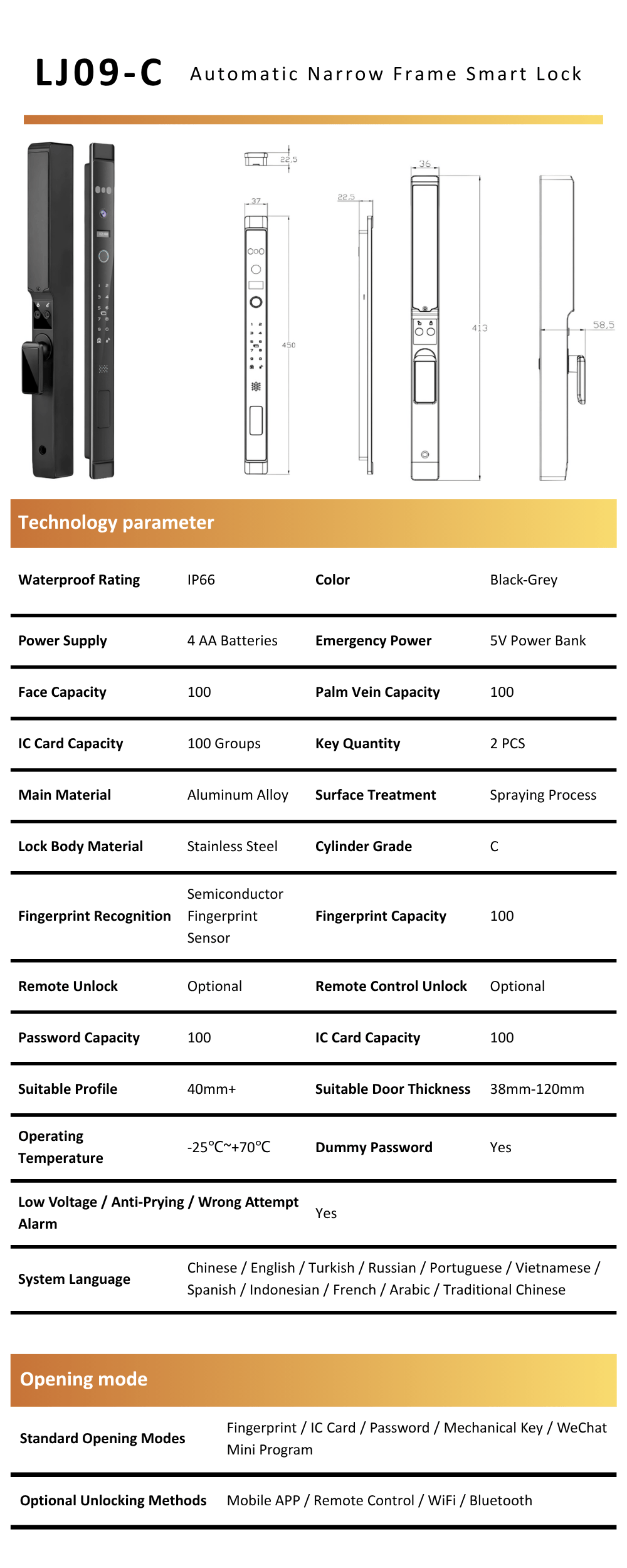The LJ09-C Automatic Narrow Frame Smart Lock is designed to provide both convenience and security. It supports a wide range of unlocking methods including fingerprint scanning, IC card access, password entry, and mobile app control. The lock is built to withstand various weather conditions with its IP66 waterproof rating, making it ideal for both residential and commercial use.