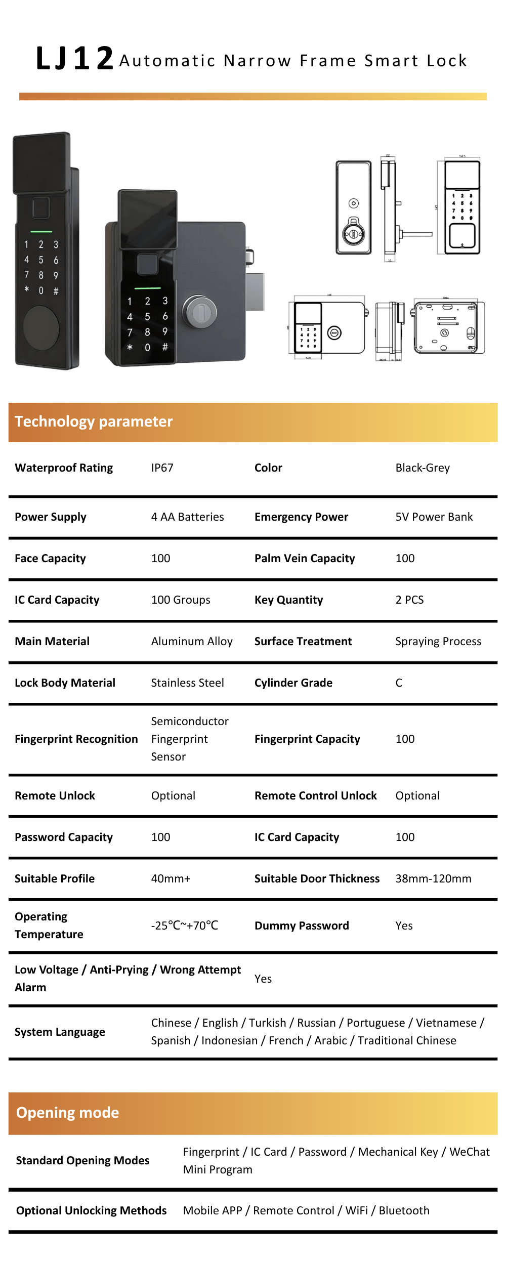 The LJ12 redefines convenience for narrow frame door access with its fully automatic design. No manual locking or unlocking is required, creating a seamless entry experience for users. It features an IP67 waterproof rating, ensuring durability in both indoor and outdoor settings. The lock integrates advanced biometric technologies including face, palm vein and fingerprint recognition, alongside traditional access methods and optional smart connectivity.