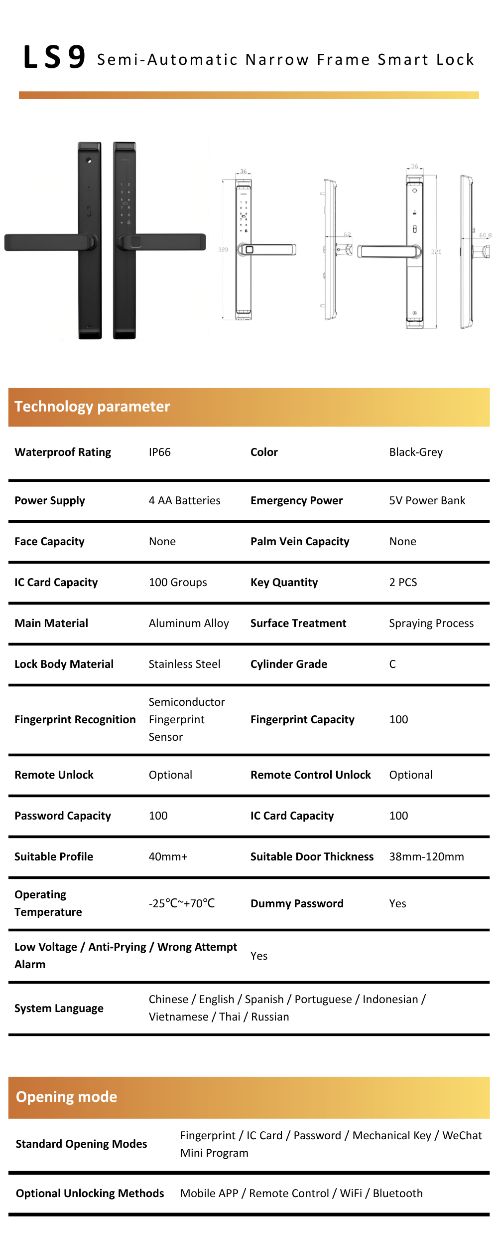 It supports multiple unlocking methods including fingerprint, IC card, password, and mechanical key, with optional mobile connectivity for flexible access. With IP66 protection and wide temperature adaptability, it is suitable for various residential and light commercial environments.