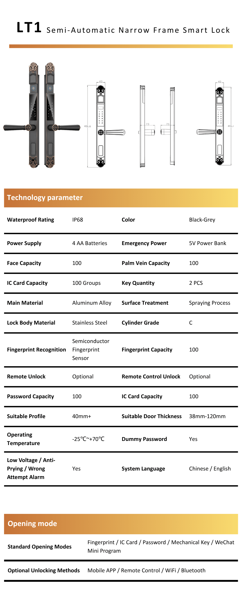 The LT1 is a luxury semi-automatic narrow frame smart lock that combines vintage aesthetics with cutting-edge security technology. It features an exquisite carved design, IP68 waterproof rating and durable aluminum alloy construction. Equipped with advanced biometric systems including face recognition, palm vein and semiconductor fingerprint sensor, it offers seamless and secure access control.