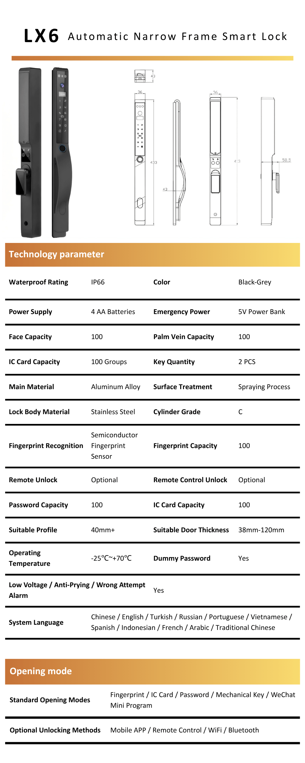 The LX6 redefines convenience for narrow frame door access with its fully automatic design. No manual locking or unlocking is required creating a seamless entry experience. Built with premium aluminum alloy and an IP66 waterproof rating it ensures long term durability.