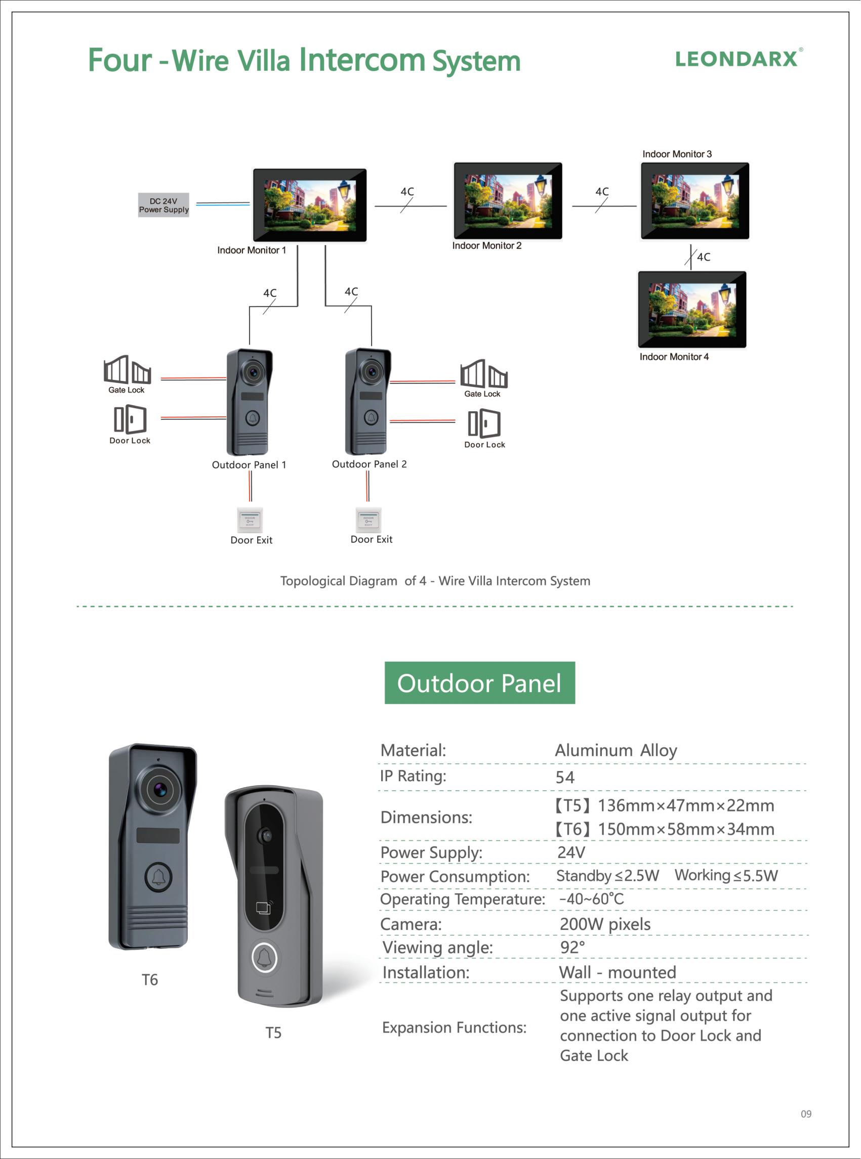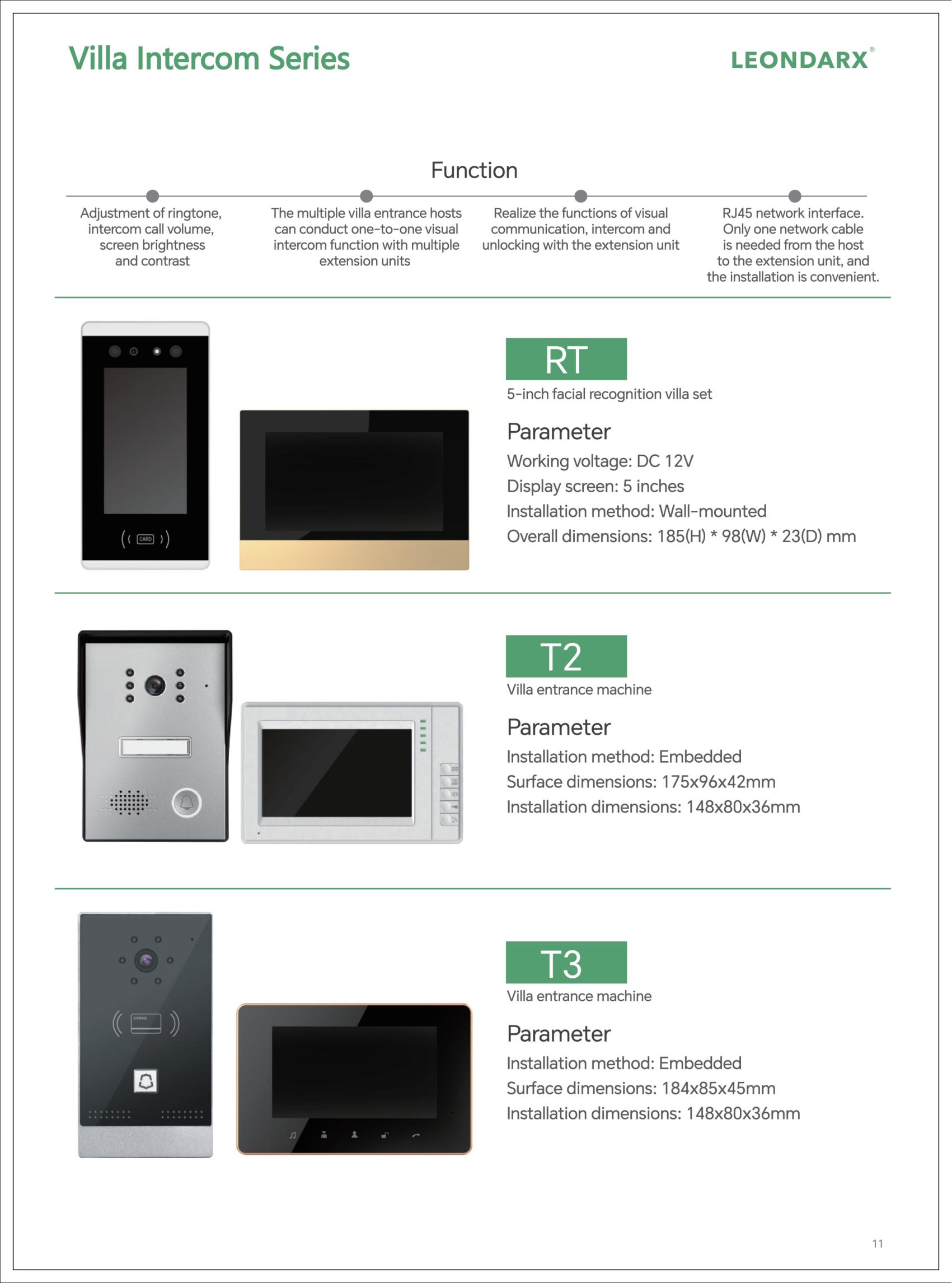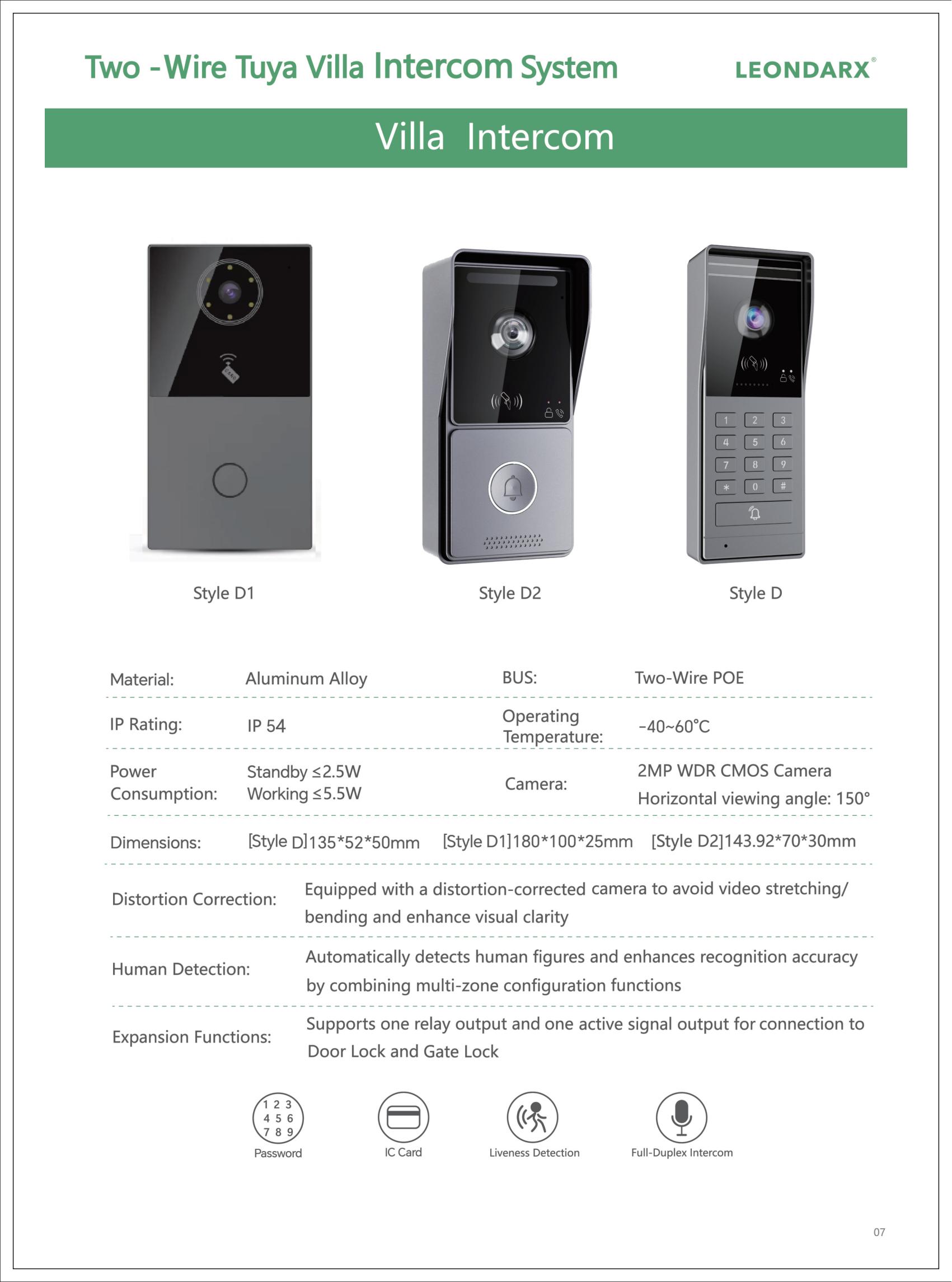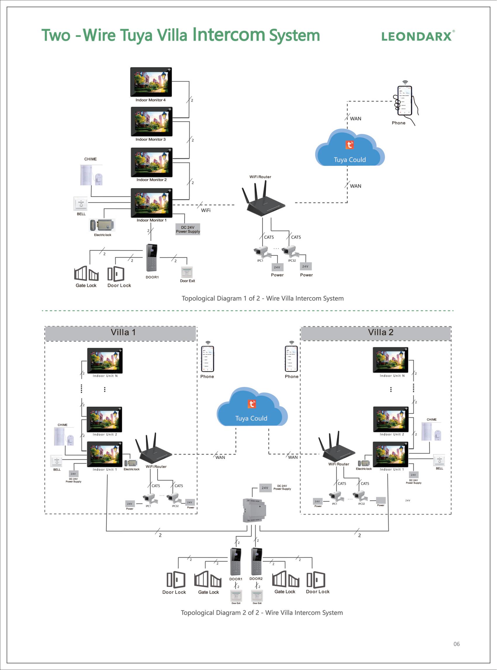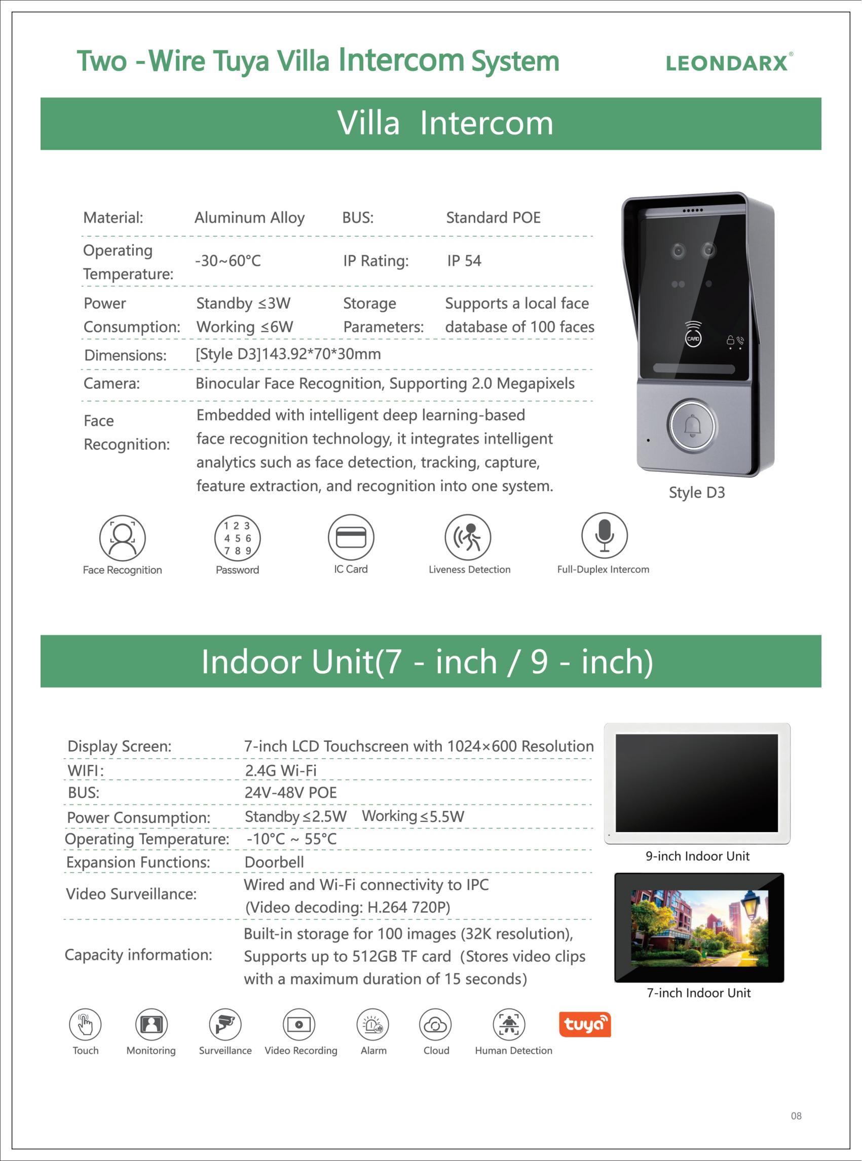 Leondarx Villa Intercom System provides a complete communication and security solution for villas, residences, and private houses.It integrates video intercom, face recognition access, remote unlocking, and Tuya App cloud management into one unified system.Available in multiple wiring configurations—2-Wire, 4-Wire, and IP series, it adapts to both new installations and renovation projects.The system supports multi-unit networking, allowing users to communicate between outdoor panels, indoor monitors, and mobile phones through the Tuya Cloud.