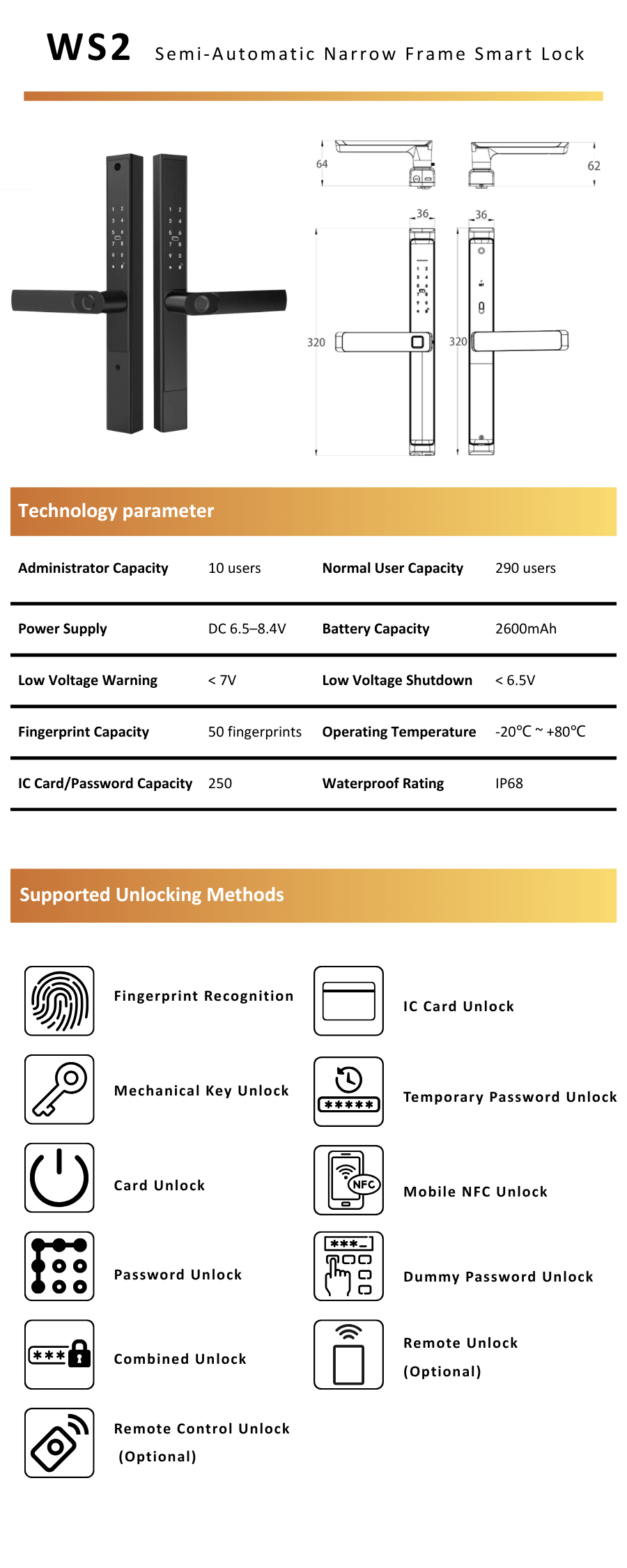 The WS2 Semi-Automatic Narrow Frame Smart Lock is designed for aluminum profile doors, combining practicality and security. With a slim, durable build, it supports multiple unlocking methods and reliable performance for both indoor and outdoor use. It features a semiconductor fingerprint sensor, long-lasting battery, and IP68 waterproof rating, suitable for daily access control needs.